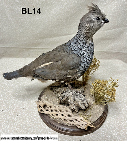 This Hard To Find Blue Scaled Quail Mount is situated on a Flat Bottom Base for Display on a Table-Top, Desk, Mantle or Shelf. Perched on a Piece of Natural Wood with Real Desert Ground Cover & Natural Material Collected in the Desert.